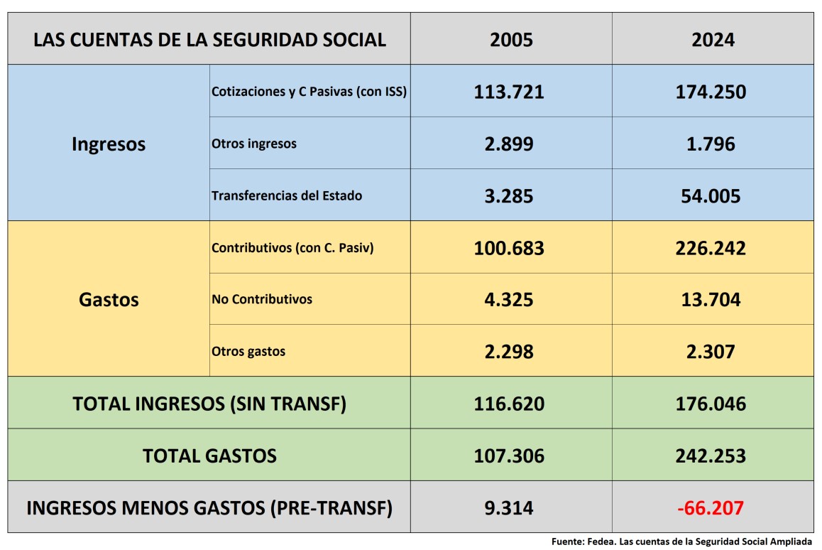 La diferencia es de 66.207 millones. Eso hay que cubrirlo, lo incluyamos en la partida del presupuesto que queramos. Ni salario diferido, ni sistema, ni gaitas. Esto hay que pagarlo de alguna manera. Por eso decimos que la discusión sobre si es o no parte de la Seguridad Social o si la transferencia del Estado hay que contabilizarla como déficit de este organismo es poco útil. En realidad, toda la diferencia la cubre el Estado con impuestos. Vemos que el déficit real es de 66.000 millones, pero la transferencia directa es de poco más de 54.000 millones: el resto es deuda que emite el Estado y que asume la Seguridad Social. Otra ficción contable sin demasiado recorrido práctico.