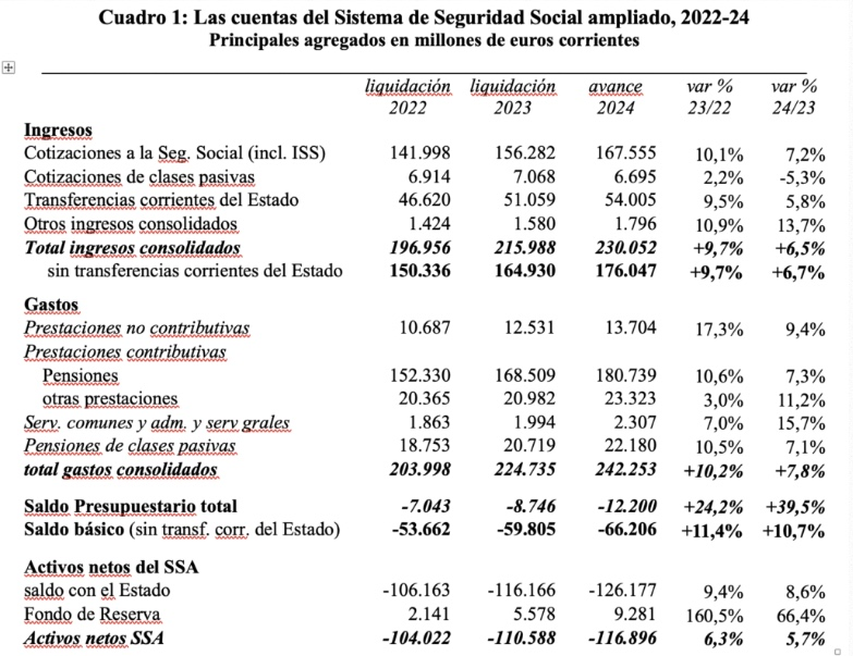 Fedea acaba de publicar su actualización de las series de las cuentas de la Seguridad Social Ampliada en las que se incorpora a la base de datos la liquidación de los Presupuestos del Estado y la Seguridad Social de 2023 así como un avance para 2024 basado en los datos de ejecución presupuestaria de ese ejercicio hasta noviembre.