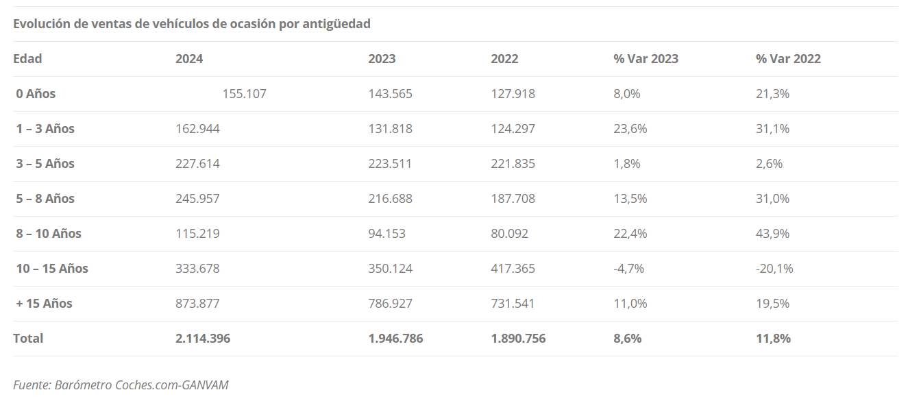 De esta manera, ya se venden en España más del doble de coches de segunda mano que coches nuevos, pues en 2024 se vendieron 2.114.396 coches de ocasión por 1.016.885 coches nuevos. En el siguiente gráfico podemos ver el desglose de estas ventas de coches de segunda mano en función de la antigüedad de estos vehículos: