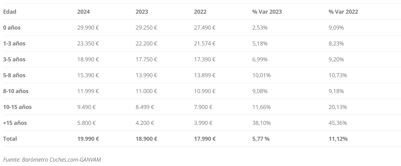 Tal y como se puede ver, el precio promedio de un coche de segunda mano en España en 2024 fue de 19.990 euros, un incremento del 11,12% con respecto a 2022, cuando tenían un precio de 17.990 euros. Si desgranamos por la antigüedad de los vehículos, comprobamos que aquellos que más han visto variar su precio han sido los que tienen más de 15 años, pasando de costar 3.990 euros en 2022 a costar 5.800 euros en promedio en 2024, un incremento del 45,36%.