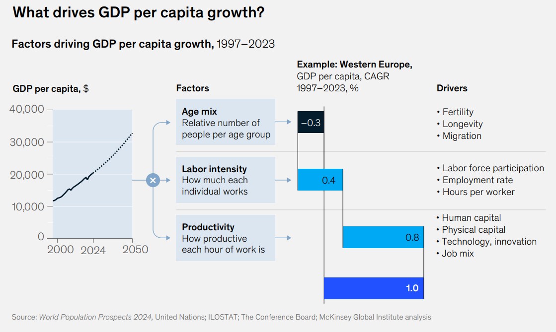 - Productividad: cuándo generamos en cada hora trabajada. Aquí se suman muchos factores: tecnología, formación, inversión en capital, adecuación de los factores productivos a su mejor uso... McKinsey cree que este punto ha añadido ocho décimas (+0,8%) al crecimiento anual del PIB de Europa Occidental.