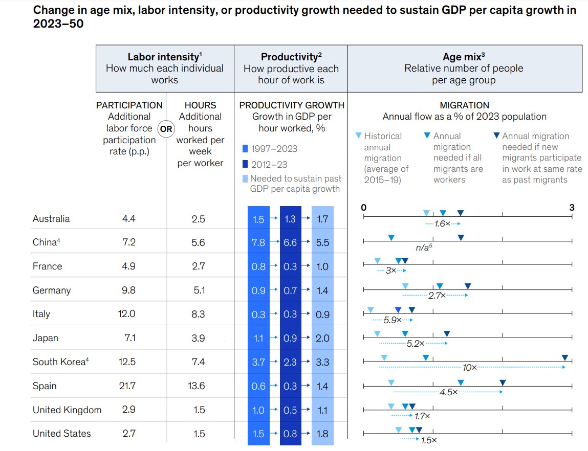 Alguien estará pensando en el decrecimiento o la caída del PIB. Desde McKinsey no son tan pesimistas. En realidad, su planteamiento parte de la convicción de que algo se seguirá creciendo gracias a la productividad (o a las malas, nos estancaremos en los niveles actuales). Y a partir de ahí, se preguntan: ¿qué necesitaría cada país para mantener el crecimiento del PIB per cápita visto entre 1997 y 2023? En España, esta cifra ha sido de un 1,1% anual: muy pobre, pero en línea con el resto de los países de Europa occidental.