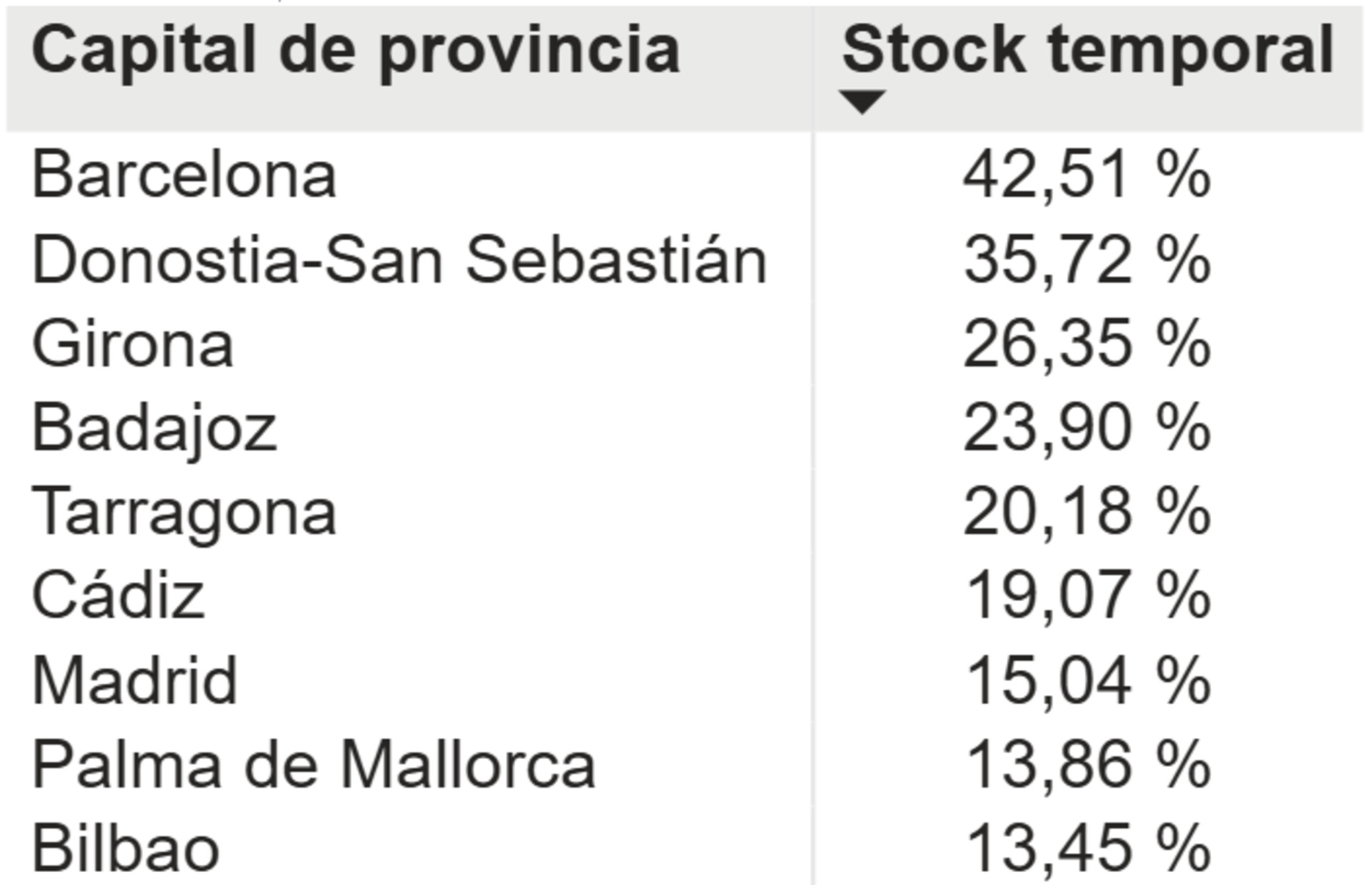 El informe señala que los alquileres turísticos han aumentado en España del 2,7% en 2019 al 13,45% en el año 2024 y en el desglose por ciudades señalan que el 42,5% de las viviendas en alquiler en Barcelona están destinadas a este propósito. La Ciudad Condal cuenta con el mayor porcentaje de pisos en alquiler turístico de toda España, seguido de lejos por San Sebastián (35,72%) y lejos de la ciudad de Madrid (15,04%).
