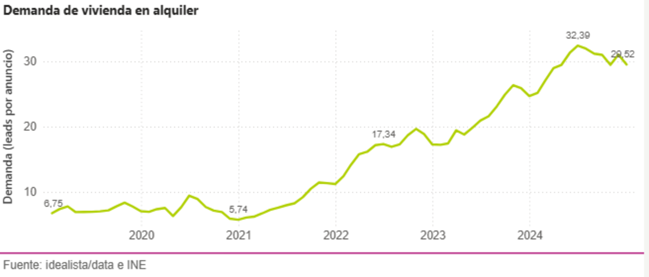 Además, señalan que la demanda de vivienda sigue aumentando según los leads del portal inmobiliario –según Idealista, un lead es un cliente potencial que está buscando alquilar o comprar y que solicita más información a la web—. La demanda de alquiler creció en 29,52 leads por anuncio en diciembre de 2024, lo que supone una subida de 4,8 puntos con respecto al mismo período del año pasado. Por otro lado, si miramos las cifras de 2019 observamos que ha habido una evolución de los 6,75 leads hasta los 29,52 de diciembre de 2024. "La presión de la demanda que reciben los inmuebles en alquiler en el portal es cada vez mayor", indica el informe.