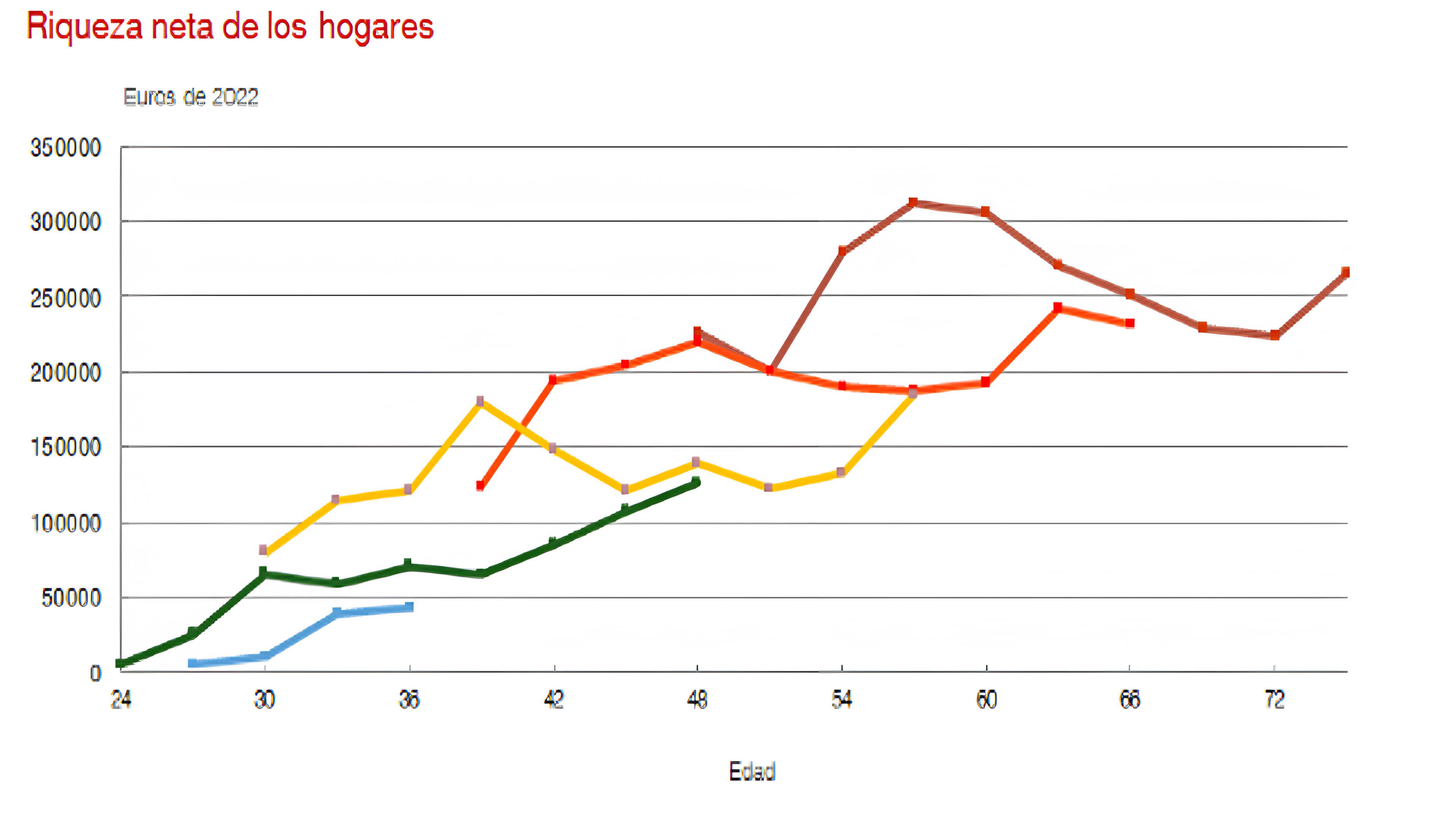 De nuevo, en el gráfico llama la atención que la riqueza neta de los hogares es mucho menor en las generaciones más jóvenes que en las de sus predecesores. Las generaciones nacidas en torno a 1960 contaban con algo más de 200 mil euros de riqueza neta mediana a los 45 años, lo que supone casi el doble que las generaciones nacidas en torno a 1980 a su misma edad (107 mil euros).