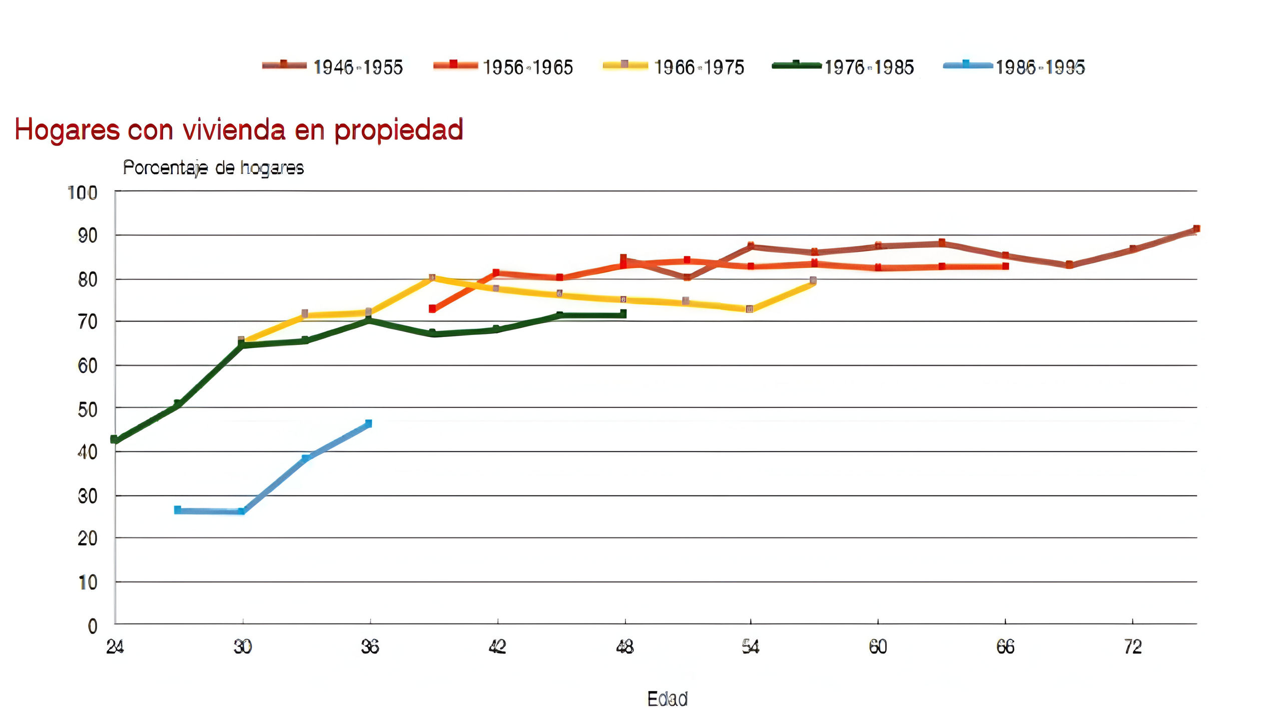 Lo más llamativo del gráfico de la vivienda es la enorme diferencia porcentual que separa a las generaciones más jóvenes de las más mayores. "Así, mientras que en las generaciones nacidas entre 1945 y 1965 las tasas de vivienda en propiedad a los 42 años se situaban por encima del 81%, en 2022, para los nacidos entre 1975 y 1985, este porcentaje era del 67%, 14 puntos porcentuales menos", señala la publicación. A esto hay que sumarle que el problema sigue intensificándose entre las generaciones que han nacido después del año 1985.