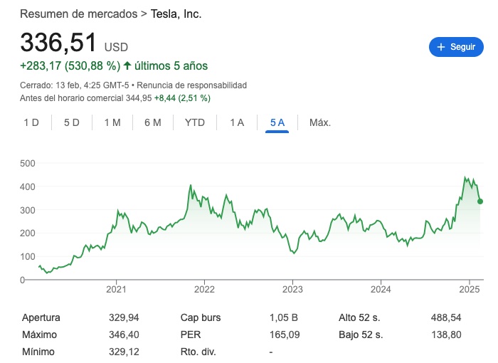 La compañía que dirige Elon Musk está de capa caída, lleva una pérdida de más del 23% desde máximos de diciembre de 2024 cuando tocó los 436 dólares. Ahora mismo cotiza 100 euros por debajo en 336, a la hora de elaborar esta noticia. Sin embargo, si ampliamos el foco, la acción de Tesla ha multiplicado por más de once desde mínimos de 2020, cuando cotizaba a 28,4 dólares.