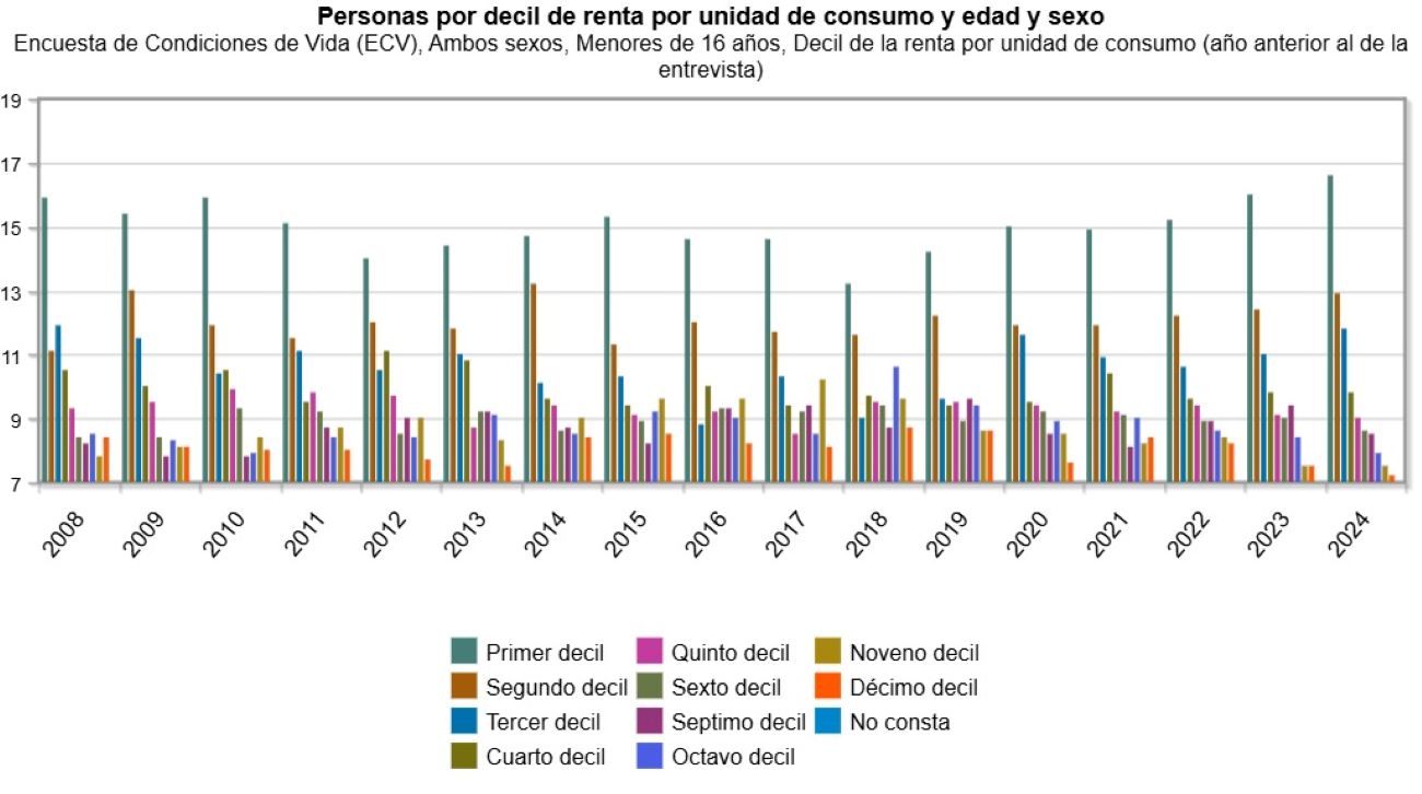 Lo cierto es que el empobrecimiento de los menores bajo el mandato de Sánchez es una realidad que reflejan también las estadísticas sobre la cantidad de personas por decil de renta y edad, que demuestran que cada vez hay más menores de 16 años que pertenecen a los estratos sociales de menor renta.