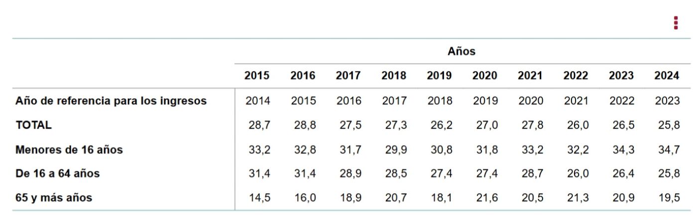 No obstante, el dato más llamativo, y acerca del cual el presidente del Gobierno no se ha pronunciado, es la cantidad de niños en riesgo de pobreza infantil. Como podemos comprobar a continuación, el 34,7% de la población menor de 16 años vivía en riesgo de pobreza o exclusión social. Así, esta tasa aumentó en cuatro décimas con respecto a 2023.
