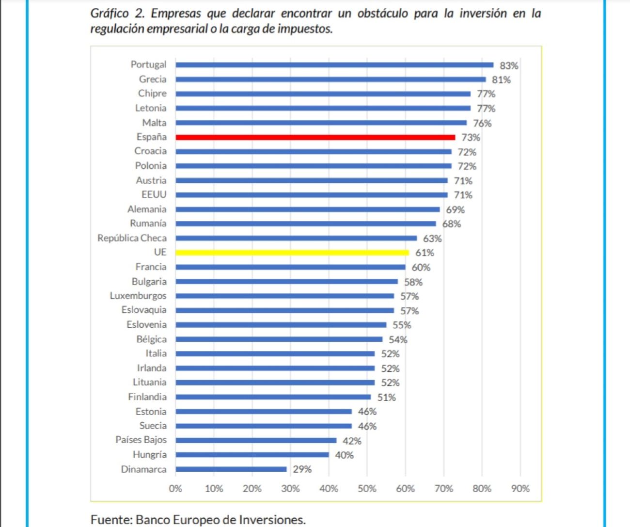 En este estudio, se refleja que los niveles de inversión en España cerraron 2024 por debajo de las cotas alcanzadas en 2019. Asimismo, siete de cada diez empresarios consideran que la excesiva carga regulatoria afecta decisivamente a la inversión. De hecho, España ocupa el puesto 97 del ranking del Banco Mundial sobre las facilidades para hacer negocios existentes en cada país.