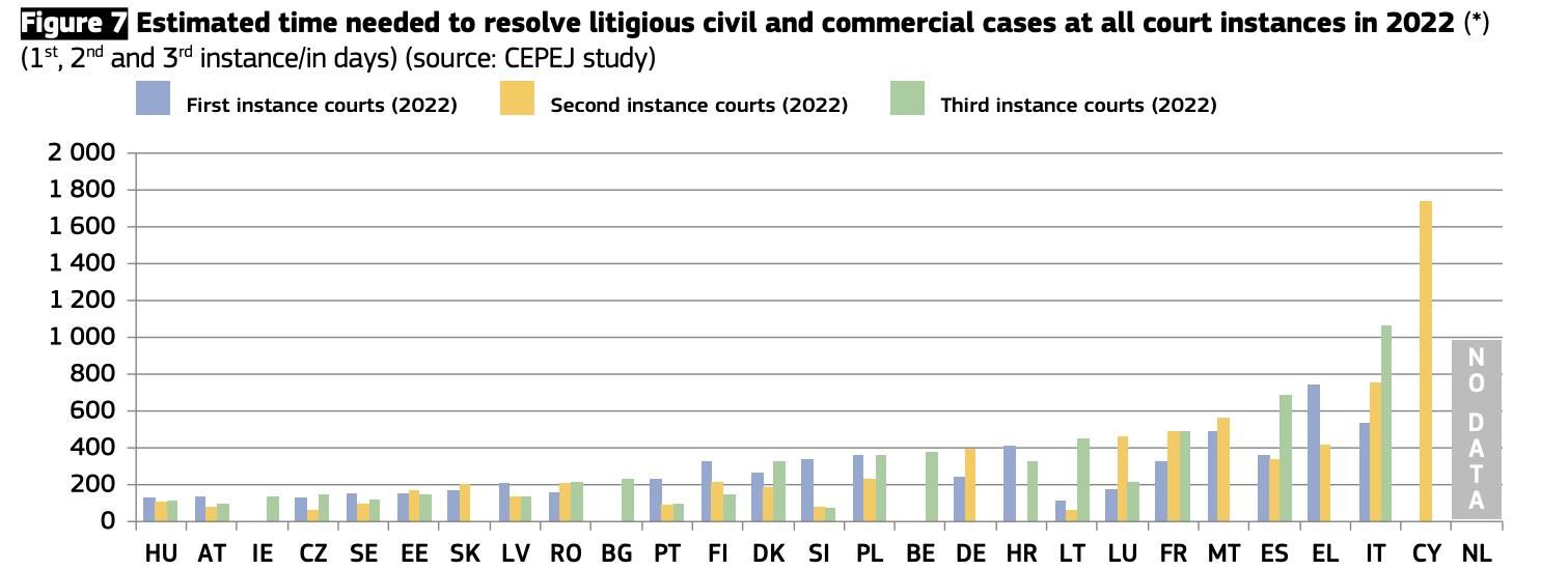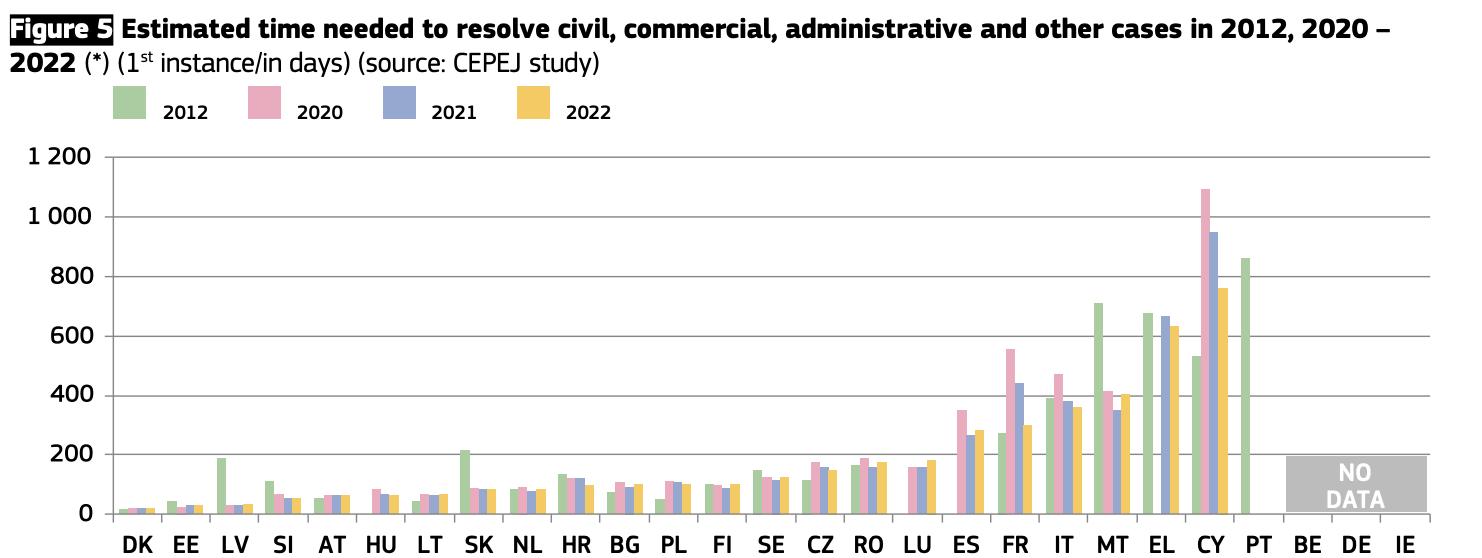 El siguiente gráfico pone de manifiesto que España es uno de los países donde más se prolonga la espera para resolver disputas civiles, mercantiles o administrativas en primera instancia, con una demora media que ronda los 300 días y que solamente es más acusada en el caso de Francia, Italia, Malta, Grecia, Chipre y Portugal.