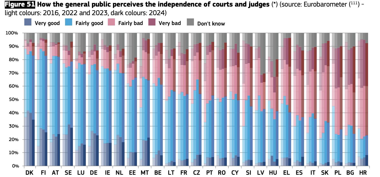 Además de los lentos tiempos de espera que presenta la justicia española, el informe divulgado por la Comisión Europea pone de manifiesto que el nuestro es el sexto país de la UE con peor resultado en lo referido a la percepción ciudadana y la confianza del gran público en el sistema de justicia. Apenas un 35% de los españoles consideran "muy bueno" o "bueno" el grado de independencia de los tribunales, en contraste con las cotas de más del 70% que se dan en otros países de la Unión.
