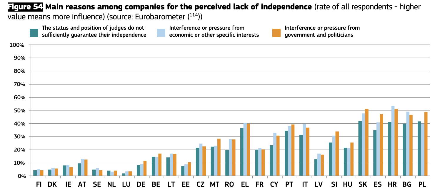 El aspecto más criticado por las empresas españolas encuestadas para el informe es el referido a la interferencia política en el sistema judicial. Somos, de hecho, el quinto país de la Unión Europea donde más personas suscriben esta preocupación, con una tasa que ronda el 45%.