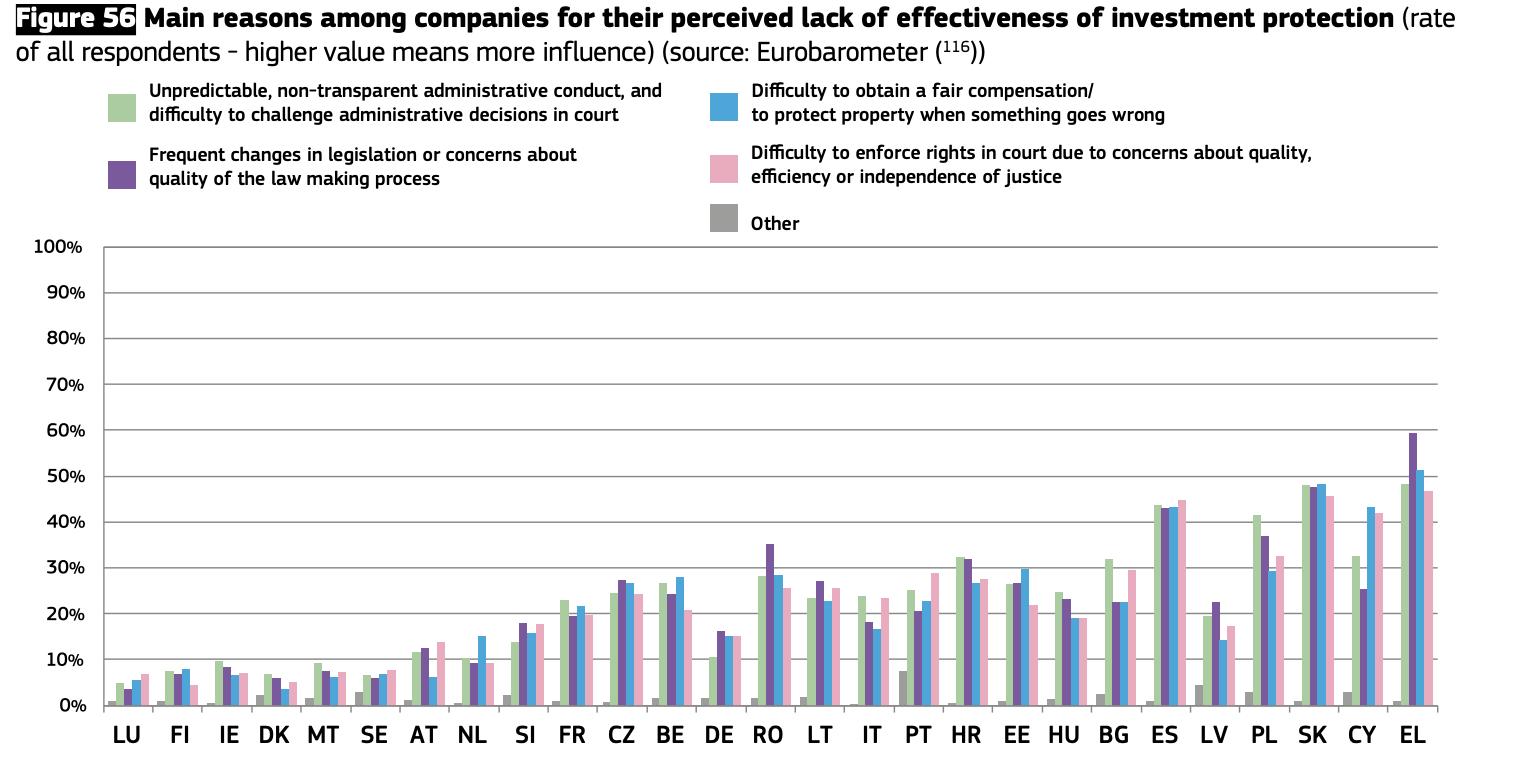 Especialmente alta es la preocupación manifestada por las empresas españolas en lo tocante a la protección y seguridad jurídica de sus inversiones. En este campo, solamente Eslovaquia y Grecia obtienen resultados peores que España. Los empresarios de nuestro país lamentan "conductas impredecibles y no transparentes por parte de la Administración, que de hecho se suman a la dificultad de litigar sobre estas cuestiones ante los tribunales", "cambios frecuentes en la legislación y preocupaciones sobre la calidad del proceso legislativo", "dificultad para obtener una compensación justa que proteja la propiedad privada cuando se demuestra que las cosas se han hecho mal" y "problemas para defender los derechos de la empresa ante los tribunales debido a las carencias del sistema judicial en términos de calidad, eficiencia e independencia".