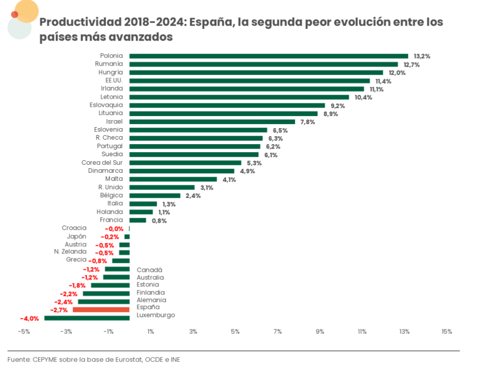 Como refleja el gráfico, de los 34 países avanzados, España fue el segundo país con peor evolución de la productividad (PIB por ocupado) entre 2018 y 2024, con una caída el 2,7%, mientras que la media de los 34 países se situó en un incremento del 4,7%.