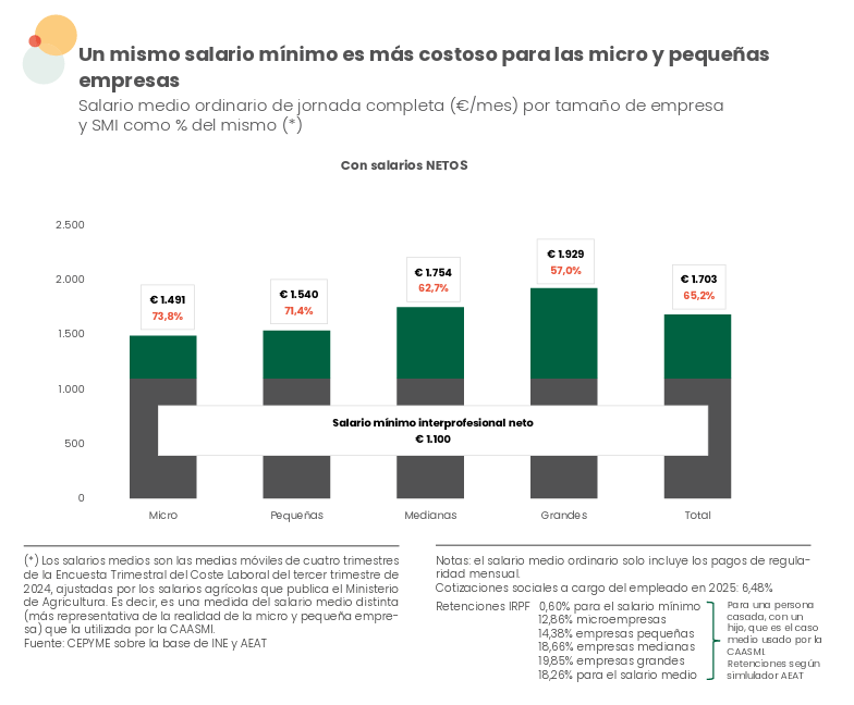 Según un reciente informe de la Confederación Española de la Pequeña y Mediana Empresa (Cepyme), la subida del Salario Mínimo Interprofesional a los 1.184 euros brutos en 14 pagas (o 1.381 euros brutos en 12 pagas) ya supone el 61,8% del salario medio neto a jornada completa. De esta manera, según apuntan desde la patronal, se habría superado el umbral del 60% de la remuneración media sugerido por la Carta Social Europea en el que el Gobierno justifica el aumento del SMI.