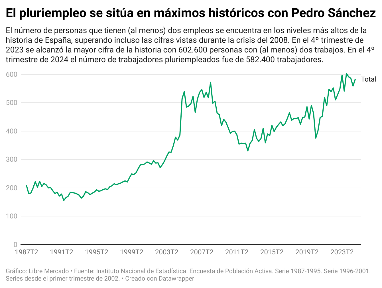 Como se puede ver en el gráfico, a finales del año 2023 había 602.600 personas pluriempleadas, y a cierre de 2024 esta cifra se ubicó en los 582.400 trabajadores con más de un trabajo. Estos números son superiores a los observados durante la crisis del 2008 y también a los vistos durante el Gobierno de Mariano Rajoy, cuando se empezó a dar más cobertura mediática a la cuestión del pluriempleo.