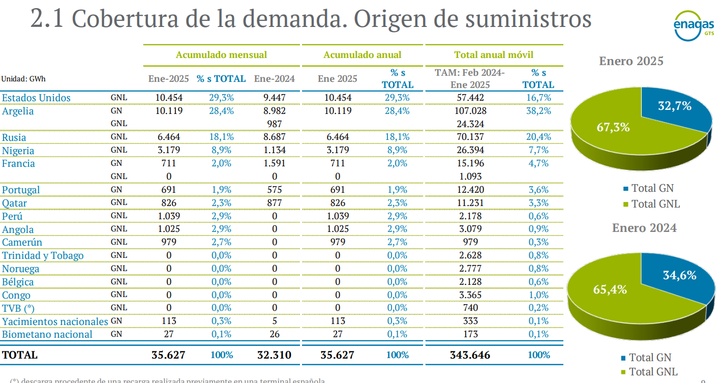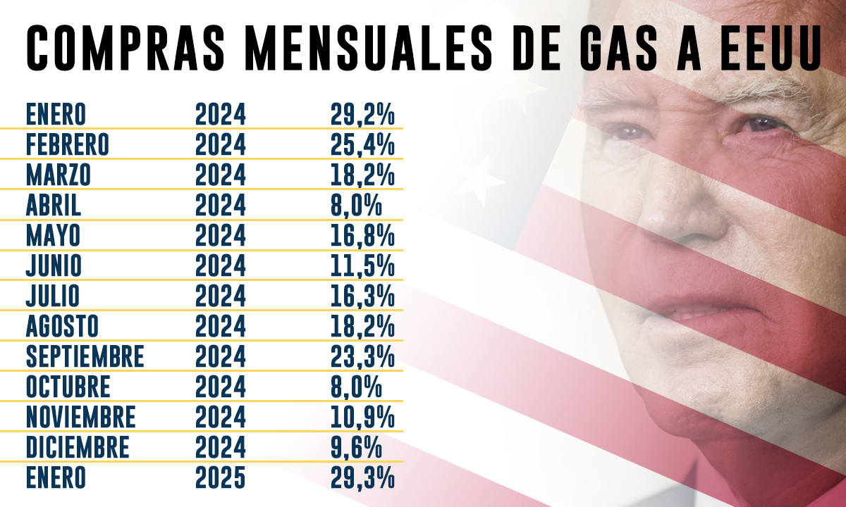Ahora, España comienza el año comprando a EEUU la mayor proporción de gas desde agosto de 2023, con ese 29,3% mensual que se observa en la tabla anterior.