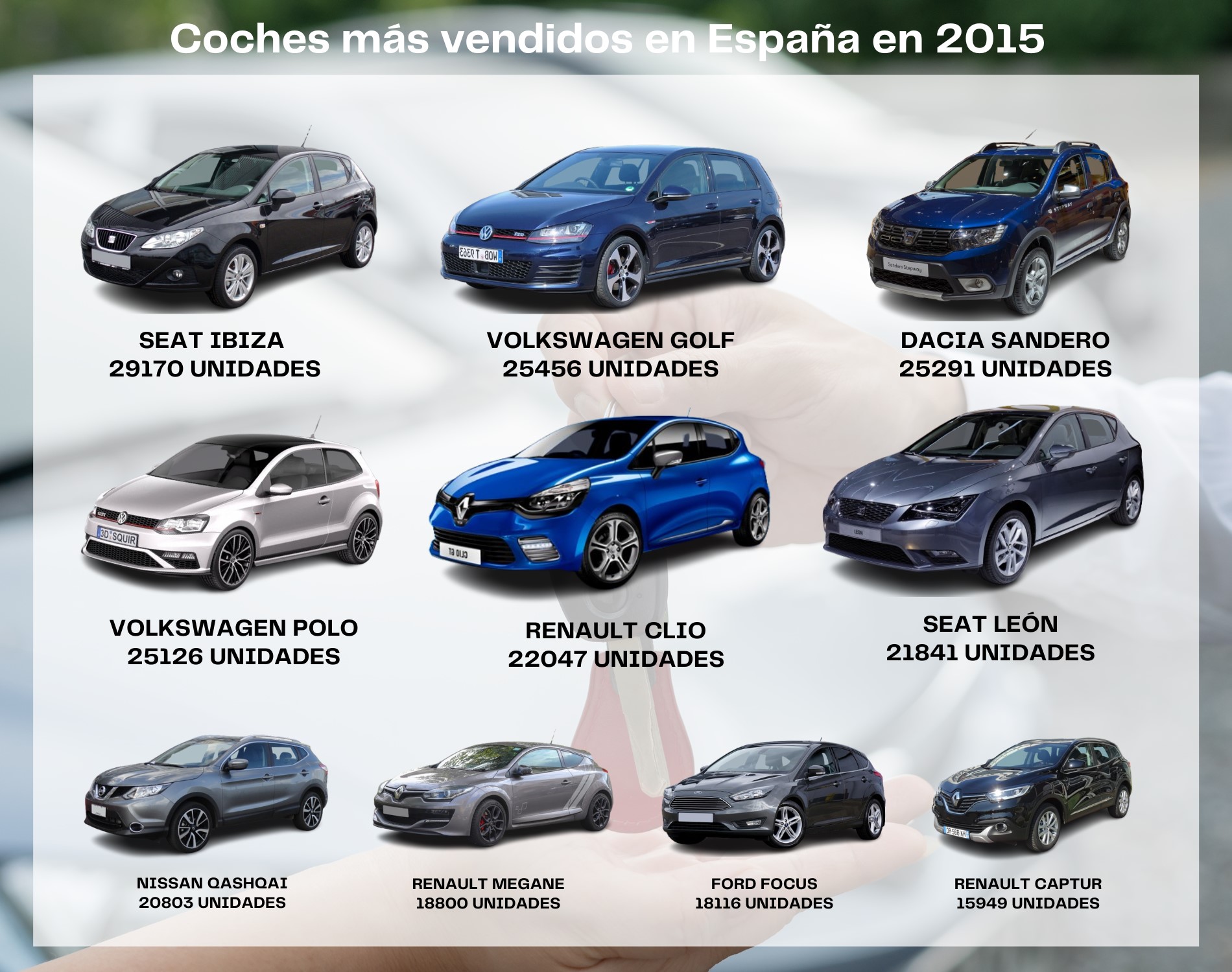 En 2015, el modelo más vendido fue el Seat Ibiza, con 29.170 unidades matriculadas. Este compacto fabricado en Martorell fue seguido de cerca por el Volkswagen Golf (25.456 unidades) y el Dacia Sandero (25.291 unidades). Completaron el ranking de los diez más vendidos el Volkswagen Polo (25.126), Renault Clio (22.047), Nissan Qashqai (22.009), Ford Focus (21.663), Opel Corsa (21.575), Renault Mégane (21.523) y Seat León (21.256).