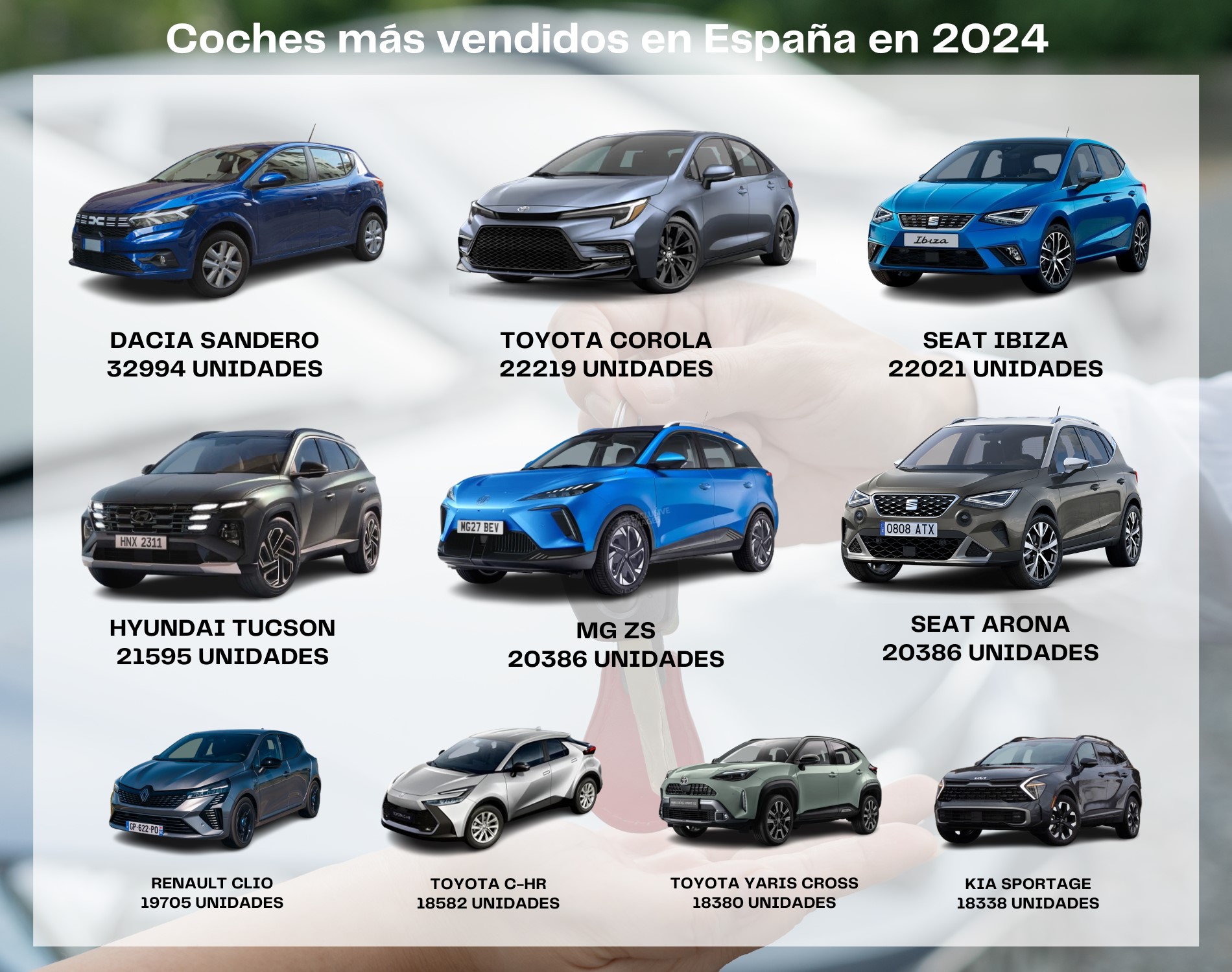 Una década después, en 2024, el ranking ha cambiado de manera considerable. El Dacia Sandero, fabricado en Marruecos, se ha convertido en el coche más vendido del año con 32.994 unidades por un amplio margen, seguido por el Toyota Corolla (22.219) y el Seat Ibiza (22.021). En el cuarto puesto se encuentra el Hyundai Tucson (21.595), seguido del MG ZS (20.386), Peugeot 2008 (19.980), Toyota C-HR (19.771), Seat Arona (19.682), Toyota Yaris Cross (18.670) y Kia Sportage (18.171). En este grupo, los Seat y el Peugeot son los únicos manufacturados en España, mientras que el MG ZS, de origen chino, ha logrado una fuerte penetración en el mercado.