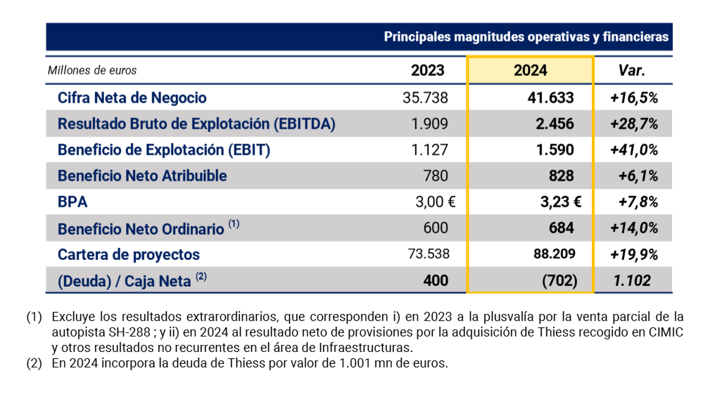 El Grupo ACS obtuvo en 2024 un beneficio neto atribuible de 828 millones de euros, lo que supone un incremento del 6,1% respecto a 2023, apoyado en la buena evolución operativa de todas las actividades, especialmente las de Turner en Norteamérica. El beneficio por acción (BPA) creció un 7,8% , hasta los 3,23 €.
