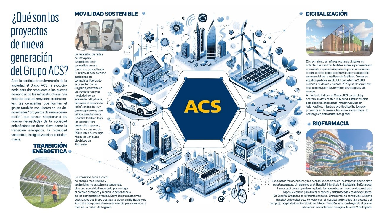 El Grupo ACS culmina hoy, con la presentación de resultados, un año clave en su transformación como líder global en nuevos sectores estratégicos y que marca la hoja de ruta que el Grupo ACS anunció el pasado mes de abril durante su Capital Markets Day. En aquella importante cita con inversores, la compañía de Florentino Pérez presentó su Plan Estratégico 2024-2026, que apuesta de forma decidida por los proyectos de nueva generación, centrados en digitalización, movilidad sostenible, transición energética, biofarmacia y sanidad, al tiempo que se mantiene la posición de liderazgo en el sector más tradicional de las infraestructuras.