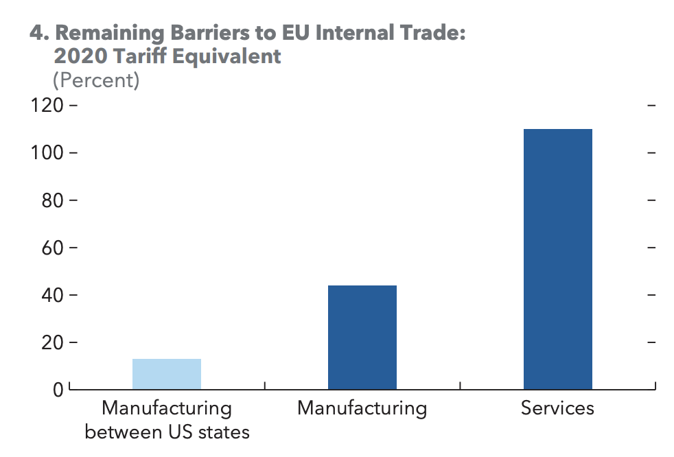 Según Draghi, en lugar de precipitarse en una escalada arancelaria, Bruselas debe reconocer que los obstáculos internos que aquejan al continente actúan, de hecho, como aranceles que deprimen el mercado interior comunitario. De hecho, el Fondo Monetario Internacional (FMI) ha situado el peso de estas barreras en torno a un 45% del precio final de venta para el sector manufacturero y hasta un 110% en el caso del precio final de venta del sector servicios. Son niveles que superan ampliamente los aranceles previstos por parte de Trump, que van del 15% al 25%.