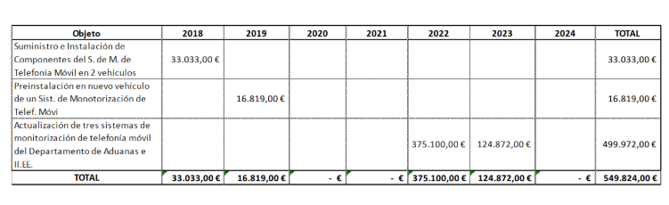 La segunda adjudicación, fechada en mayo de 2019 y consultable aquí, incluyó la adquisición de una preinstalación en nuevo vehículo de un sistema de monitorización de telefonía móvil con destino al Departamento de Aduanas e Impuestos especiales, el cual costó 16.819 euros.