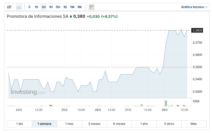 Este viernes, Prisa escala nada más y nada menos que un 8,57% hasta los 0,38 euros por acción. Una cota que no se registraba desde el pasado mes de junio, cuando tras las elecciones europeas y la fuerte derrota del PSOE se vislumbraba la posibilidad de que Vivendi tomara un papel más protagonista en Prisa y saneara su situación financiera.