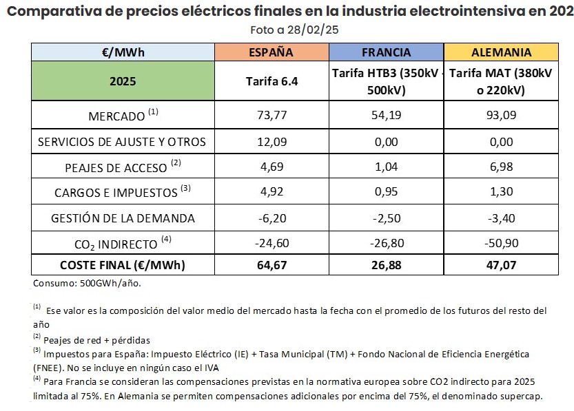 Del mismo modo, señalan que "sin esta reducción la factura energética del consumidor electrointensivo se verá incrementada un 5%, aumentando la brecha con sus competidores europeos, principalmente de Francia y Alemania". A este respecto, indican precisamente que "para las empresas electrointensivas, (...), estas medidas permitían reducir la brecha competitiva (...)".