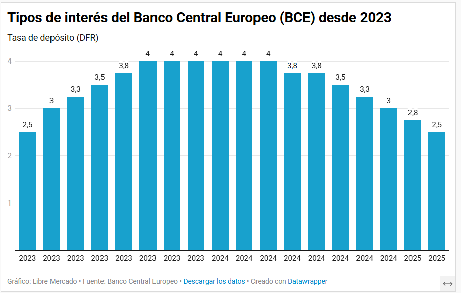 Este jueves el Consejo de Gobierno del Banco Central Europeo (BCE) ha anunciado una bajada de los tipos de interés de 25 puntos, con lo que la tasa de depósito (DFR) pasa a situarse en el 2,5%, la cifra más baja desde febrero de 2023 cuando también se situó en el 2,5%, mientras que la tasa de referencia para sus operaciones principales de refinanciación (MRO) quedará en el 2,65% y la de facilidad de préstamo (MLF) en el 2,9%.
