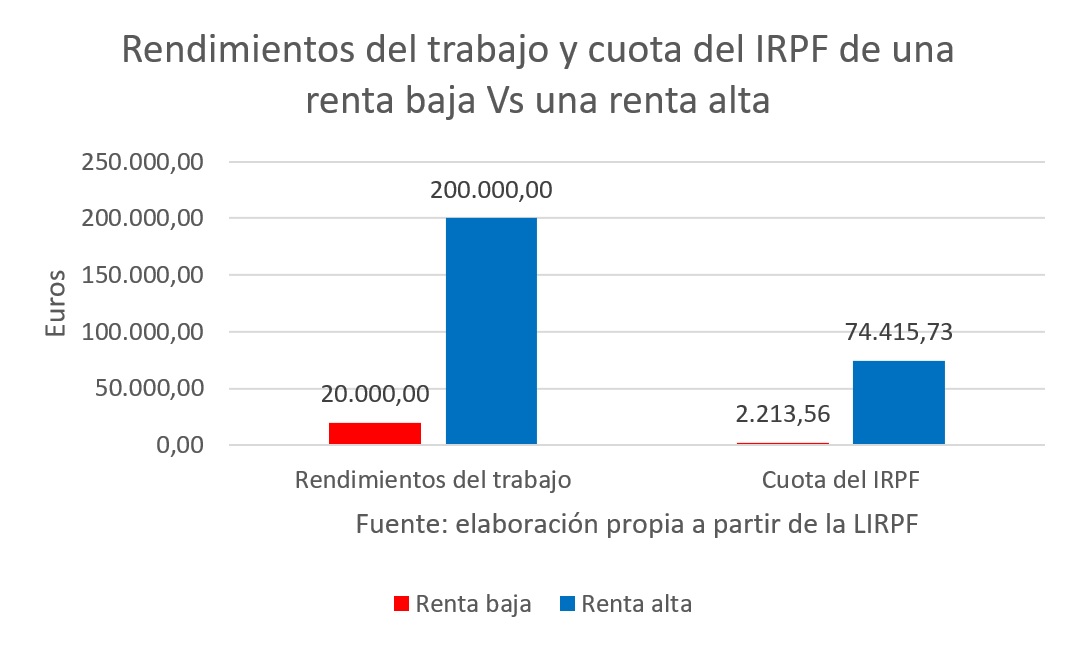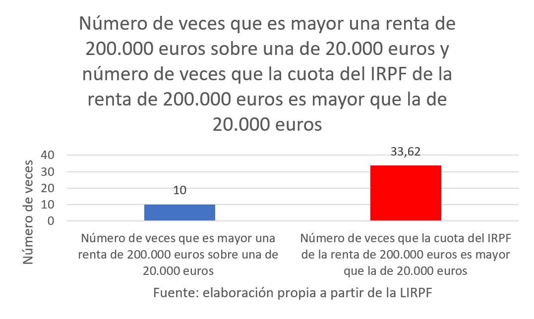 Es decir, una renta de 200.000 euros gana diez veces más que una renta de 20.000 euros, pero paga 33,62 veces más, en clara desproporción.