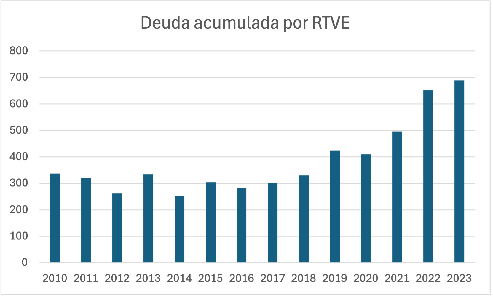 El siguiente gráfico muestra la evolución de la deuda acumulada por RTVE entre los años 2010 y 2023, bajo el actual sistema de financiación de la corporación, que prescinde de la publicidad y financia la operativa de la radio y televisión estatal con un sistema híbrido que combina tasas abonadas por operadores privados del sector audiovisual con aportaciones presupuestarias del gobierno central.