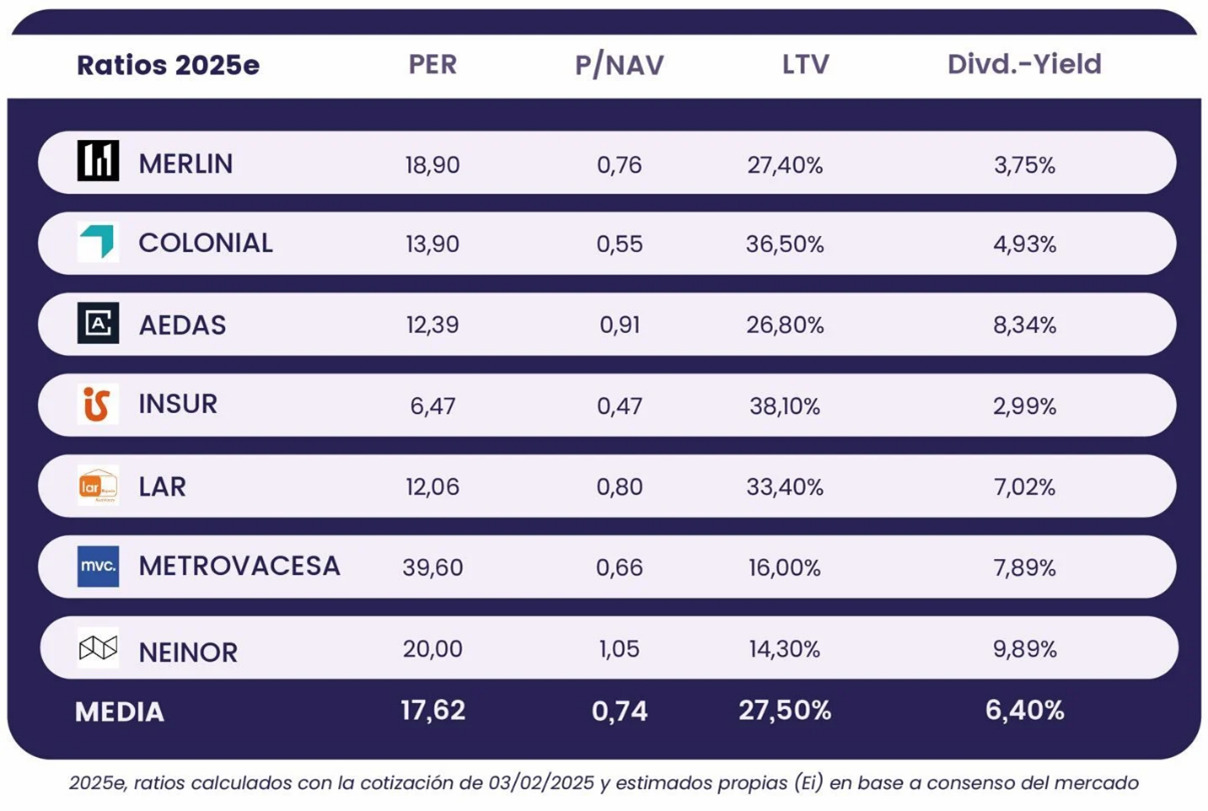 De ahí que sea uno de sus puntos fuertes en el mercado. Para María Mira, analista fundamental de Estrategias de Inversión , "las más generosas son Neinor con un 9,89% y Aedas en el 8,34%, no muy lejos de Metrovacesa, que aporta una rentabilidad vía dividendo a sus accionistas del 7,89%. En síntesis, vemos mayor descuento y, por tanto, mayor potencial en INSUR, Colonial y Metrovacesa. Si la inversión busca dividendo, entonces las recomendadas son Neinor Homes, Aedas Homes y Metrovacesa".