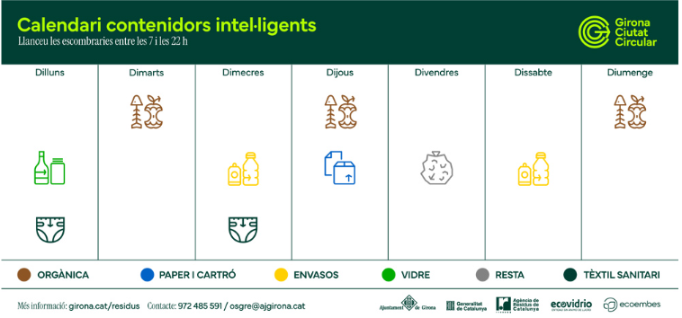 Esto último es una de las cosas que más llama la atención de este nuevo sistema, ya que hay un calendario para tirar la basura según el tipo de residuo que sea, por ejemplo, en Gerona los lunes sólo se pueden tirar a la basura residuos de vidrio o de material sanitario, los martes sólo se pueden tirar residuos orgánicos, etc. En esta imagen podemos ver cómo es el calendario en Gerona.