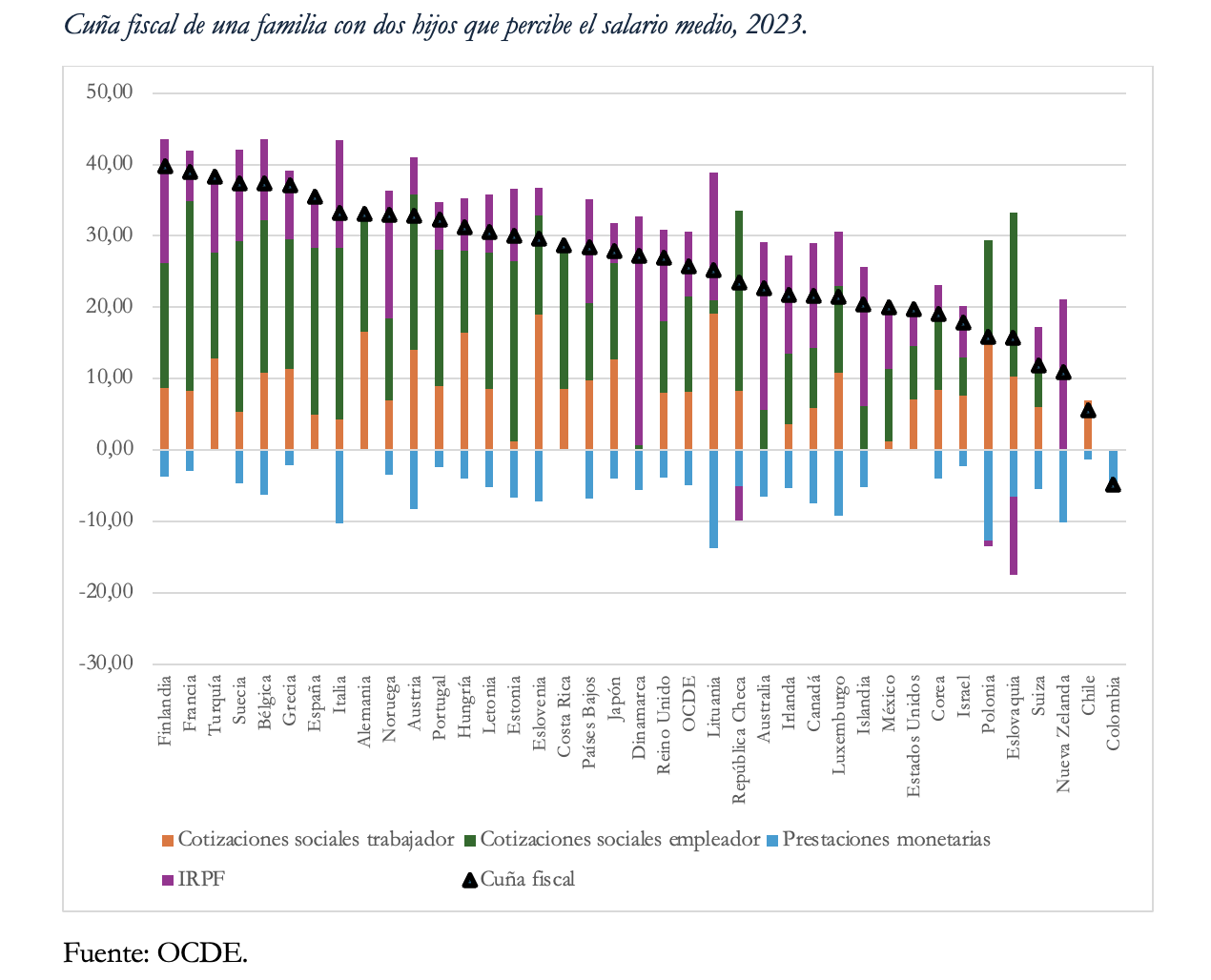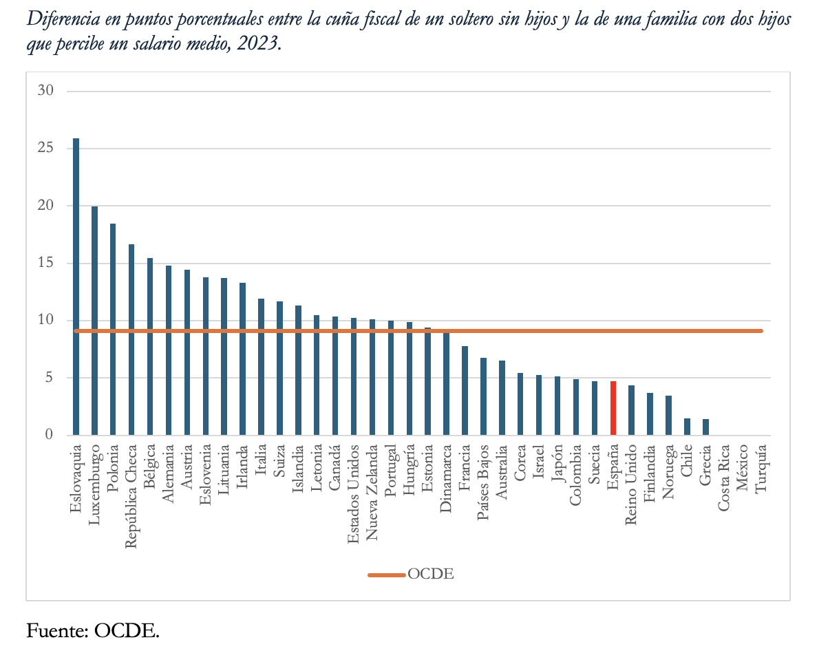 El mensaje que lanza el sistema español es claro: tener hijos no tiene ventajas fiscales relevantes y, de hecho, en nuestro país se ofrecen descuentos tributarios que son entre un 30 y un 50 por ciento más bajos que los observados en la OCDE. A ello hay que sumarle el hecho de que no hay una compensación equivalente en forma de un mayor gasto público en beneficio de las familias.