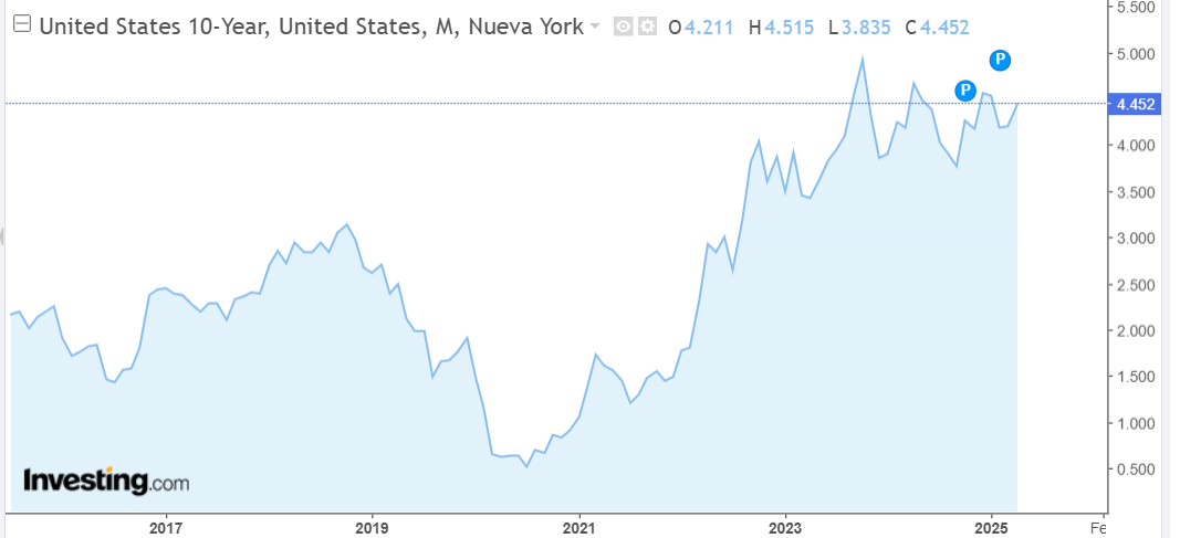 El bono a 10 años ha llegado a subir hasta ofrecer un rendimiento del 4,47%, aunque a estas horas de la tarde se ubica en torno al 4,45%. Esta cifra contrasta con la que se observaba la jornada del "Día de la Liberación", el día 2 de abril, cuando el bono a 10 años ofrecía una rentabilidad del 4,05%. Esta es la evolución del bono a 10 años en los últimos 10 años.