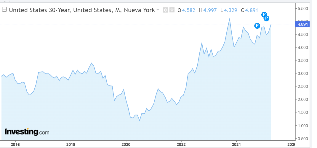 Por su parte, el bono a 30 años ha estado a punto de llegar a dar un rendimiento del 5% en el día de hoy, aunque se sitúa en la actualidad en torno al 4,89%, cifra que el pasado 2 de abril podíamos ver oscilando el 4,45%. Así pues, vemos que el desencadenamiento de la vorágine arancelaria de Donald Trump ha tenido mucho que ver en esta subida en el rendimiento de sus bonos del Tesoro. Aquí podemos ver la evolución del bono a 30 años desde 2015.
