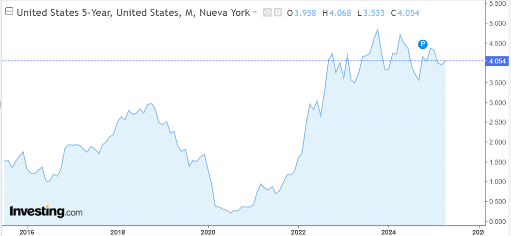 Esta misma tendencia alcista también se ve reflejada en el bono americano a 5 años, que si el pasado día 2 de abril cerró con un 3,8% de rendimiento al finalizar la jornada, actualmente su rentabilidad oscila el 4,05%. Algo distinto está sucediendo con el bono a 2 años, ya que se está dando prácticamente el mismo rendimiento que venía dando hace justo una semana, cuando entraron en vigor los aranceles de Donald Trump, rondando el 3,77% de rentabilidad. En este último gráfico podemos ver la evolución de los bonos del Tesoro de EEUU a 5 años desde 2015.