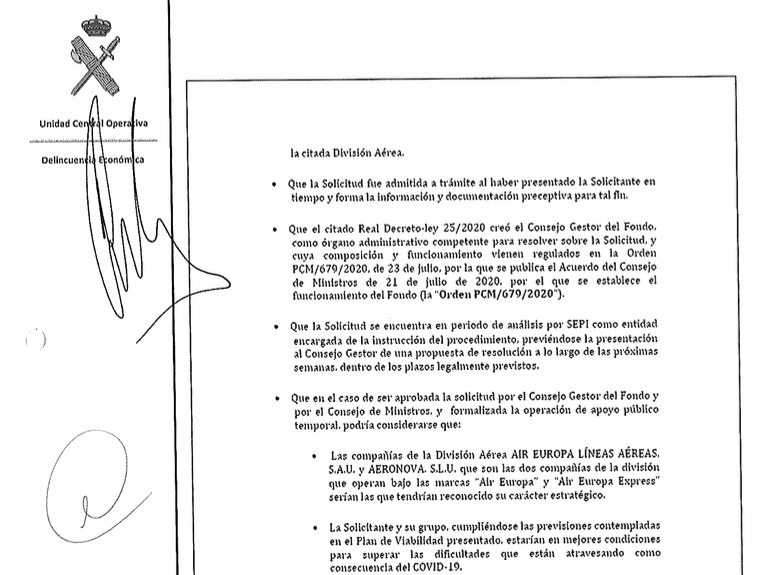 Y no debe olvidarse que todo ello ocurrió antes de que se concediera oficialmente el rescate: "El 3 de noviembre de 2020, el Consejo de Ministros aprobó una ayuda a al aerolínea Air Europa de 475 millones de euros a través del Fondo de Apoyo a la Solvencia de Empresas Estratégicas (FASEE), el cual es gestionado por un Consejo Rector presidido por el Presidente o Vicepresidente de al SEPI". Y, "a modo de recordatorio, el día 7 de agosto de 2020, Aldama remitió un mensaje a Francisco Javier Hidalgo Gutiérrez que contenía el texto de la nota de prensa, de la que varios medios de comunicación se harían eco al día siguiente". O, lo que es lo mismo, también la nota de prensa fue filtrada previamente a los beneficiarios.