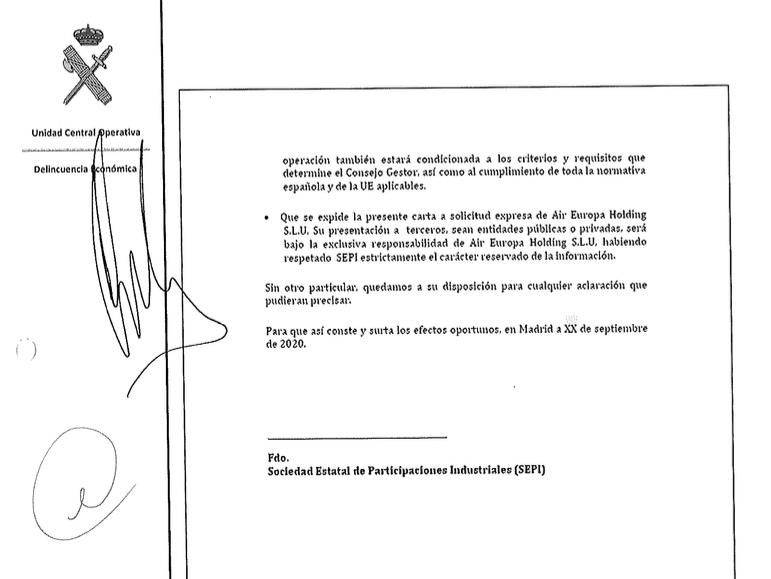 La carta fue firmada el "XX de septiembre de 2020". La fecha del documento, efectivamente, figura como "XX". Pero el documento está en poder de la UCO, como se puede comprobar en el documento que muestra Libertad Digital. El texto de esa carta señalaba lo siguiente: "Que la Solicitud [del rescate] se encuentra en periodo de análisis por SEPI como entidad encargada de la instrucción del procedimiento, previéndose la presentación al Consejo Gestor de una propuesta de resolución a los largo de las próximas semanas, dentro de los plazos legalmente previstos.