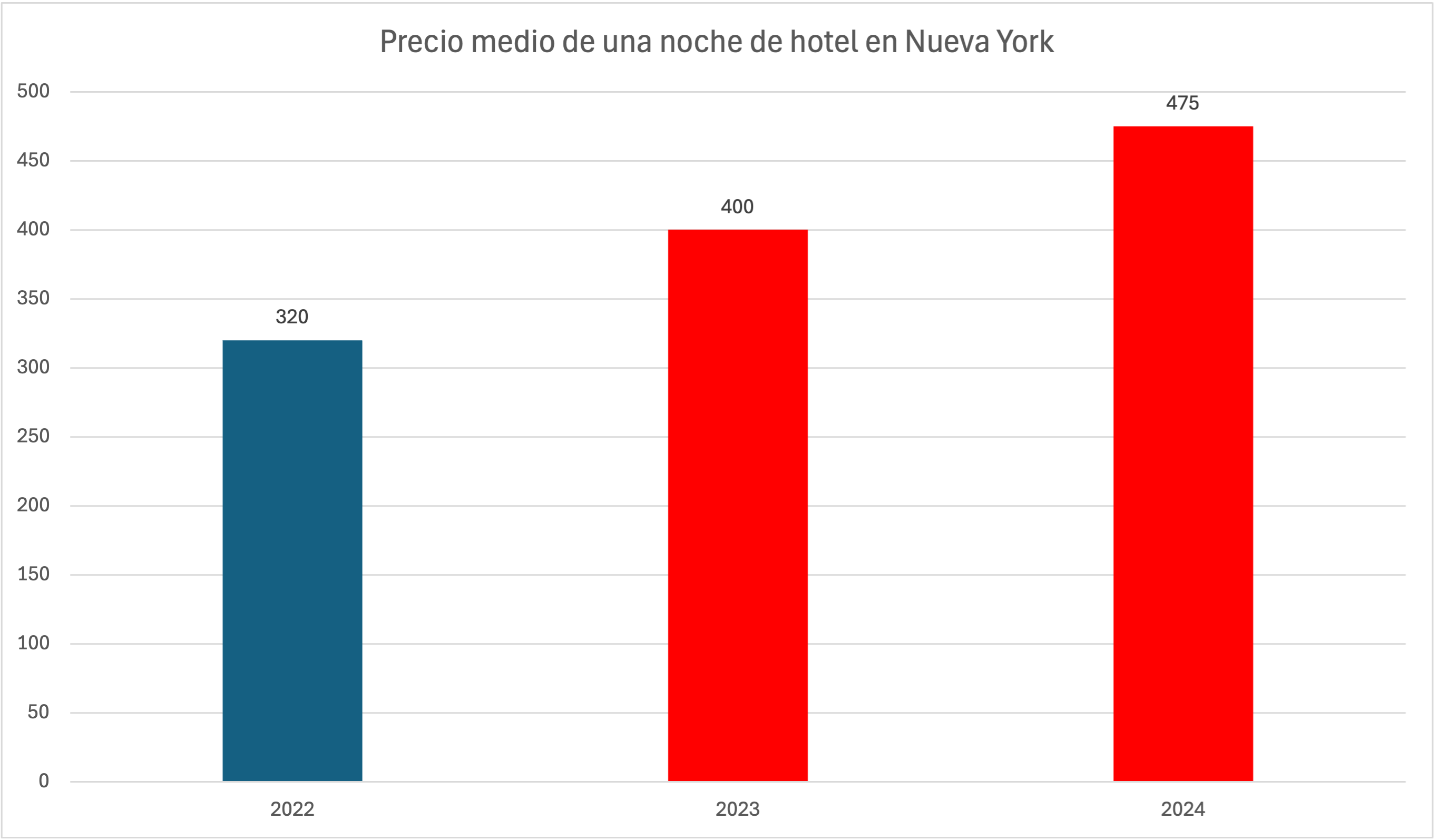 Una noche de hotel en Nueva York costaba en 2022 un promedio de 320 dólares. Sin embargo, esta cifra se ha disparado hasta los 475 dólares en 2024. La inflación acumulada observada durante este periodo fue del 9%, de modo que 125 de los 155 dólares de incremento se deben a una subida de precios por encima del nivel general de IPC.