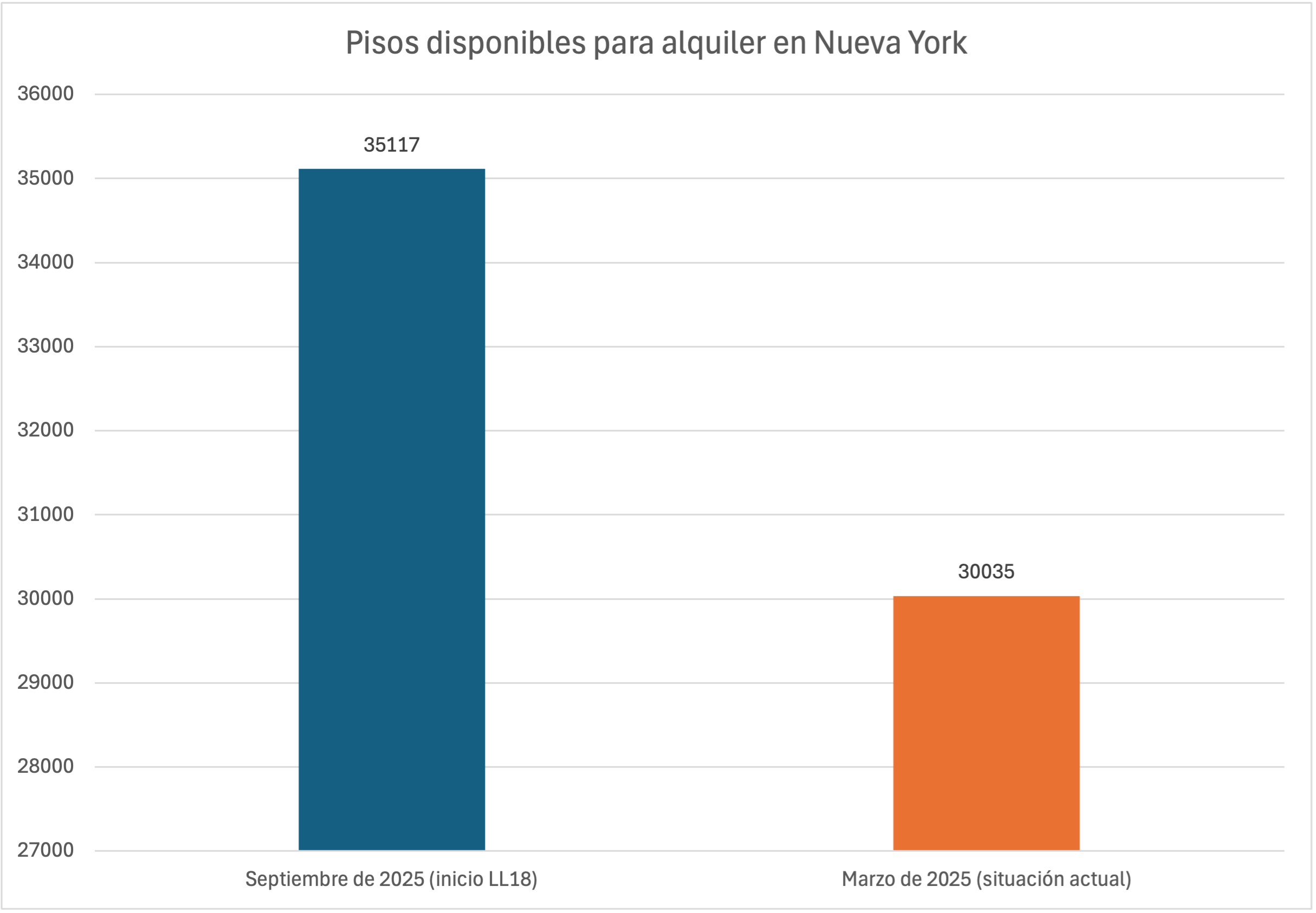Durante este mismo periodo, la cifra de unidades residenciales disponibles en el mercado de alquiler ha caído, que no aumentado, de modo que los neoyorquinos no se han beneficiado del incremento de oferta que anticipaban los promotores de la regulación. EasyStreet, la web de referencia en el mercado inmobiliario de la ciudad, contaba 34.858 pisos disponibles para arriendo en septiembre de 2023, cuando entró en vigor la ordenanza. Sin embargo, en marzo de 2025, esta cifra había caído a 32.049 unidades.