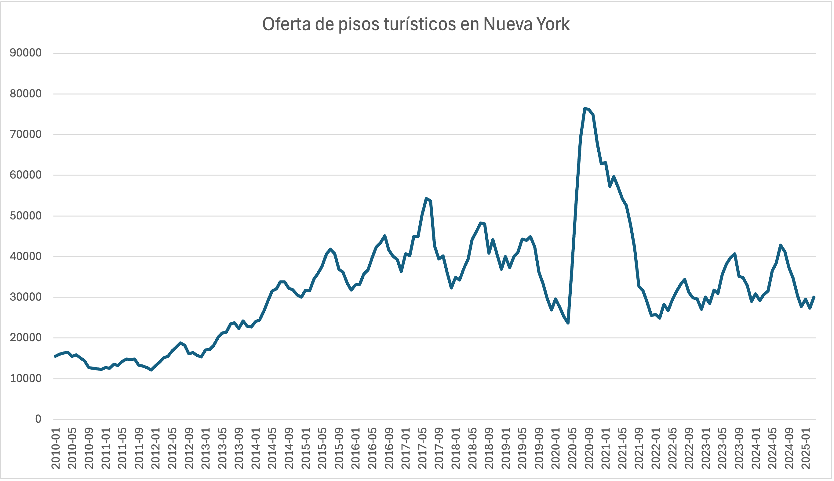 El caso es que, pese a todo el intervencionismo descrito en los párrafos anteriores, los precios del alquiler, que alcanzaban un promedio mensual de 2.764 dólares cuando se introdujo la nueva ordenanza en 2022, han aumentado hasta los 2.840 dólares en febrero de 2025. Por tanto, el saldo final que hoy presenta el mercado neoyorquino es uno de menos oferta y precios más altos, a lo que se debe sumar el golpe propiciado a los turistas, que pagan precios mucho más elevados.