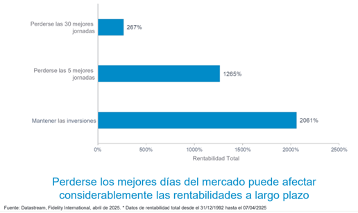 Se debe evitar salir y entrar de las inversiones. Lo que ocurre cuando se pierden las 5 y las 30 mejores jornadas del S&P 500 (1993-2025)