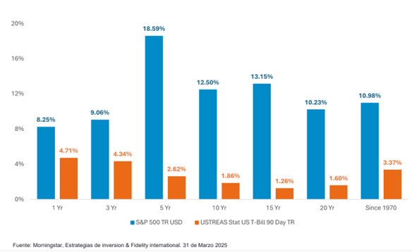 A largo plazo, el riesgo bursátil suele obtener recompensa. Rentabilidades de la inversión por clase de activos (% anual) – EE.UU. (31 Marzo 2025)