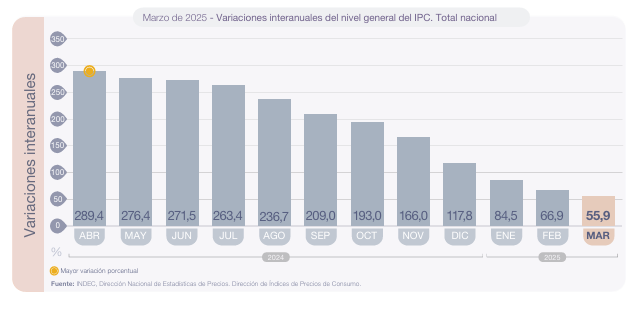El siguiente gráfico muestra cómo las políticas implementadas por Milei han reducido drásticamente la inflación, cuya tasa interanual cae del 280% al 56%. Resulta evidente, pues, que los cambios anunciados no son un salto al vacío, sino un paso más en una apuesta seria, respaldada internacionalmente y basada en principios de libertad económica.