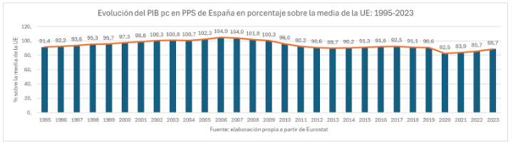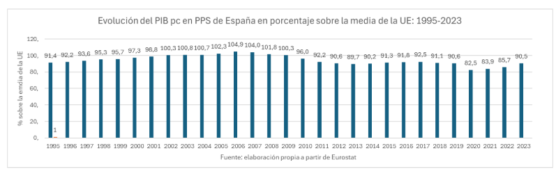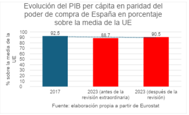 Eso provoca que el crecimiento español, además de ser cortoplacista, se impulsa, en gran parte por crecimiento de población, pero con pérdida de prosperidad, como muestra la evolución de PIB per cápita en paridad del poder de compra, donde España ha dejado de converger y ha retrocedido respecto de la media de la UE, quedando de nuevo por debajo del 90% de dicha media, aunque haya sido elevado después para el mismo año hasta ese 90% con la revisión extraordinaria del PIB que ha habido, no por ganancias reales de riqueza, volviendo a ser potencial receptor de fondos de cohesión a los que optan los países más pobres de la UE.