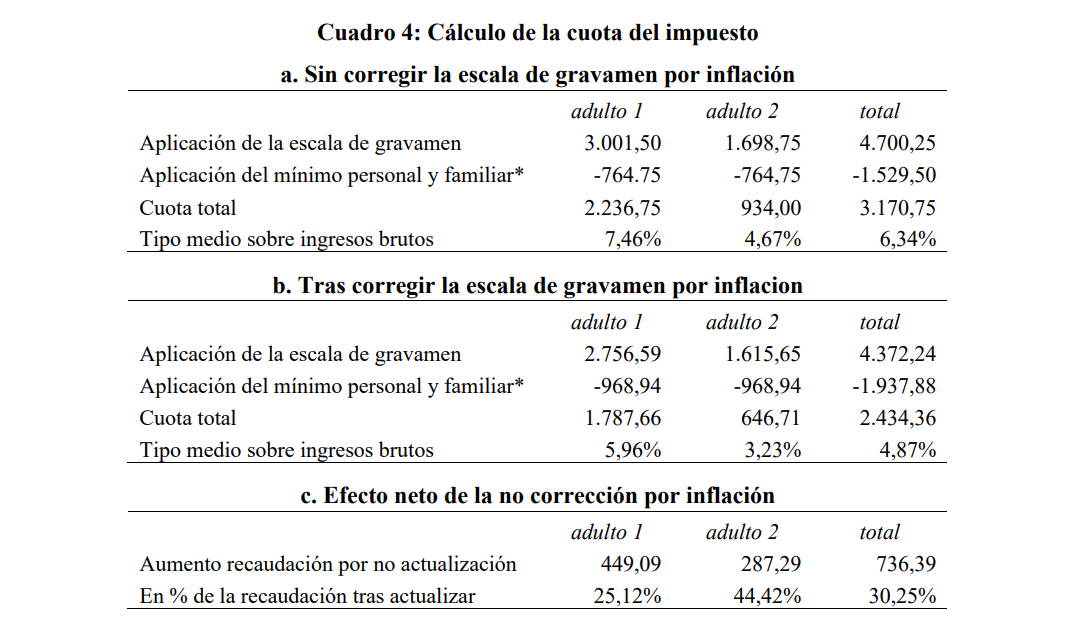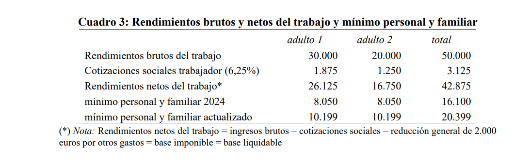 En el siguiente cuadro se observa el ejemplo de no actualizar el mínimo del IRPF para el Adulto 1, que declara unos rendimientos del trabajo de apenas 30.000 euros al año, para el Adulto 2 (20.000 euros) y para la familia (Adulto 1 + Adulto 2 = 50.000 euros). En todos se supone que los adultos trabajan y que no tienen otras fuentes de renta o derecho a alguna deducción.