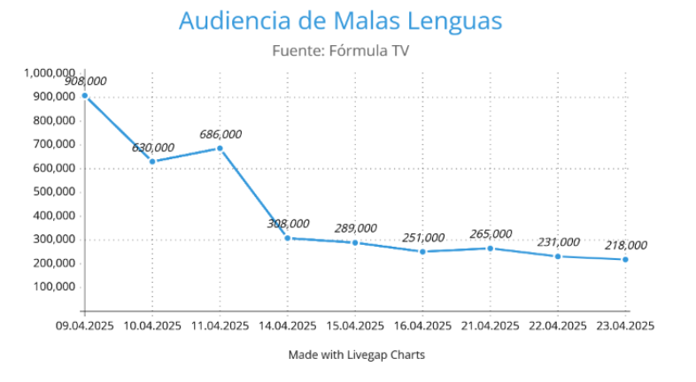 Según informó anteriormente Libre Mercado, el desembolso económico para Malas Lenguas asciende a aproximadamente dos millones de euros. Sin embargo, datos actualizados revelan que la pérdida de espectadores ha alcanzado un 76% en tan solo 14 días, comenzando con un estreno simultáneo en La 1 y La 2 de 908.000 espectadores, al segundo día ya tuvo un descenso del 31% de los televidentes, el lunes de la semana pasada llegó a perder otras 378.000 personas de público, otra disminución del 55% tras dejar de ser emitido simultáneamente en la primera cadena de TVE y hasta los 218.000 reportados el 23 de abril.
